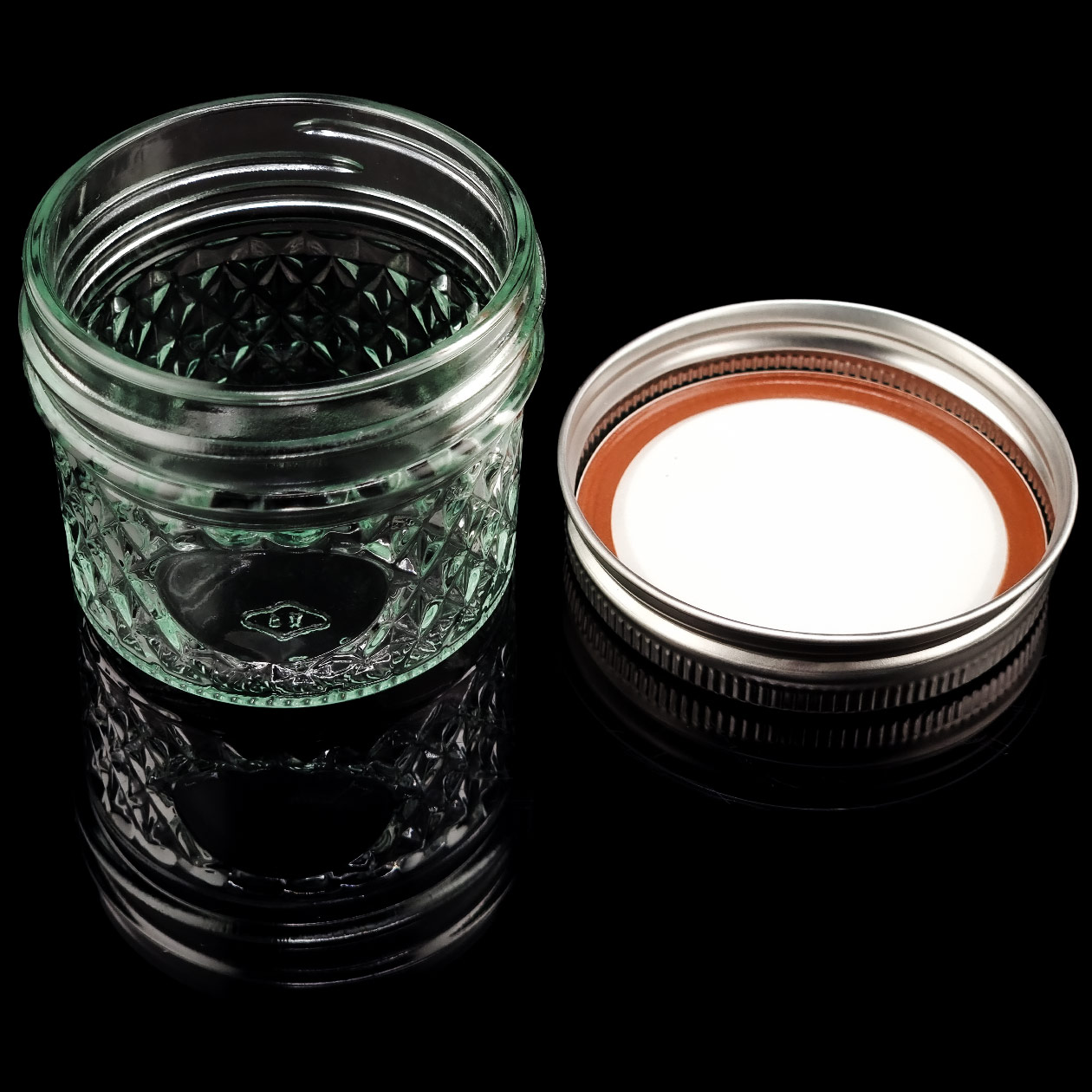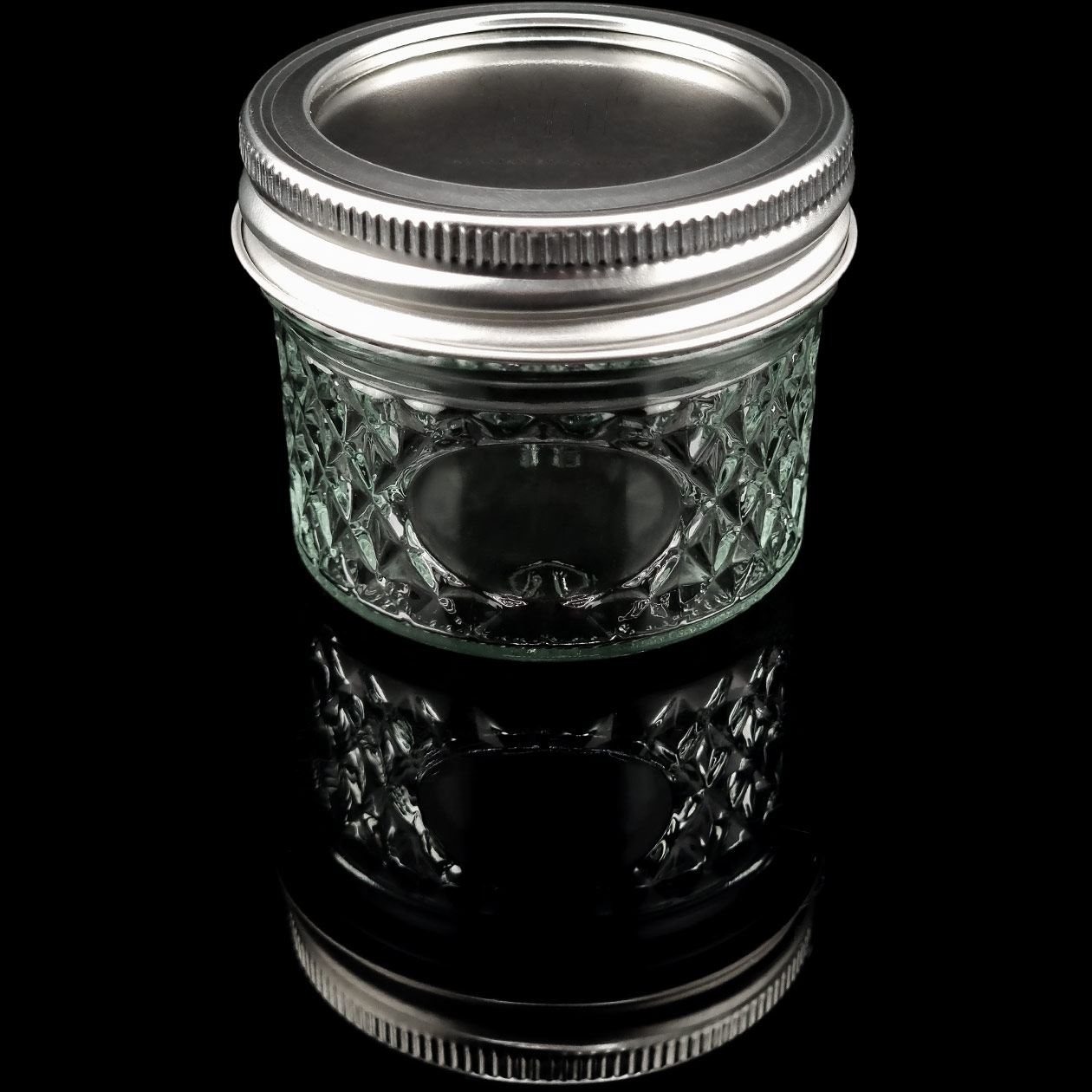 Unsere extra großen XXL Extrakt Jars/Mason Jars/Einmachgläser „BALLR“ mit 120 ml Fassungsvermögen (4 oz) aus transparentem Glas mit Rautenmuster-Verzierung, Sichtfenster/Etikettenaussparung und stylishem sowie funktionalen 2-tlg. Schraubdeckel mit exklusiver BAVARIAN BOTANICALS Gravur.
