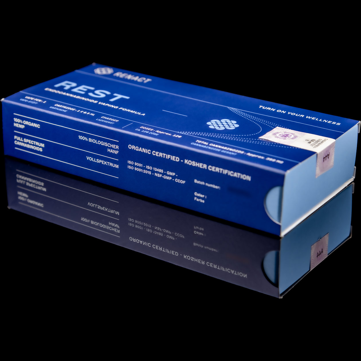 Reicht für ca. 120 Züge/Puffs. Inhalt Kartusche: 0,5 ml Vollspektrum-Hanfblätterextrakt (aus 100% biologischem Hanf), ca. 356 mg Cannabinoide (72%-Formel: CBD, CBG, CBN, CBC und CBDV) sowie natürliche Hanf-Terpene (Caryophyllene, Guaiol, Phytol und Bisabolol). Nur reine Extrakte, ohne Nikotin, ohne PG/VG/MCT. Bio-zertifiziert, koscher-zertifiziert. Hergestellt in der EU.